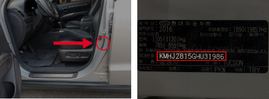 A Vehicle Identification Number(VIN, or Chassis number) is a code assigned to every vehicle when manufactured. You may find the VIN on the driver's side door pillar. Open the door and look around the area where the door latches to the car.