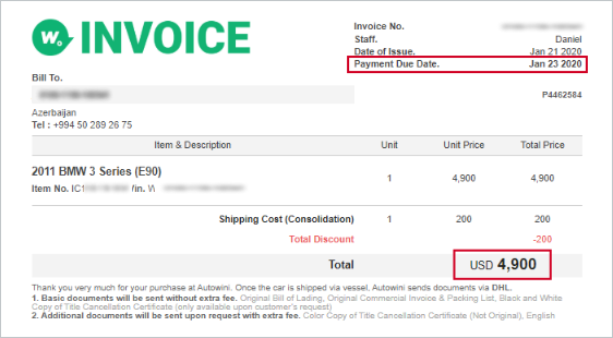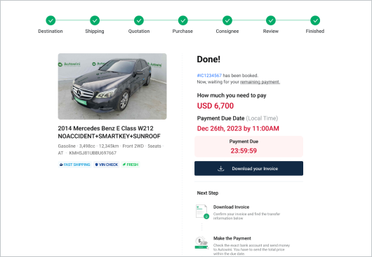 Transfer the money to Autowini’s bank account within the payment due date stated in the Invoice. Make sure to remember the payment deadline. If the payment is not made within the due date, your booking will be cancelled automatically and the vehicle will be sold to the next buyer.