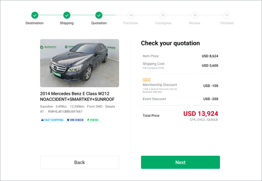 Search for the vehicle you want to purchase and check the item details on item details page. Autowini provides the condition report, inspection report, and featured information based on vehicle’s insurance history using the VIN number. Also, compare prices of the same models to browse more vehicles.