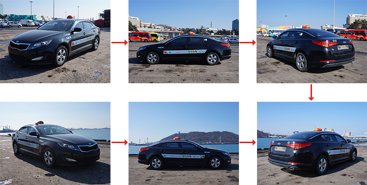 Step 1차량을 공간이 넉넉한 곳으로 이동시켜, 간격을 두고 차량 외부 모습을 한바퀴 촬영 한다.